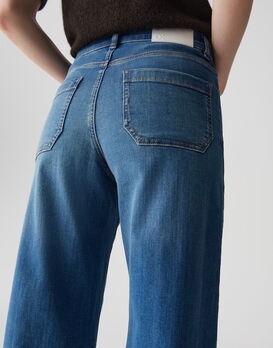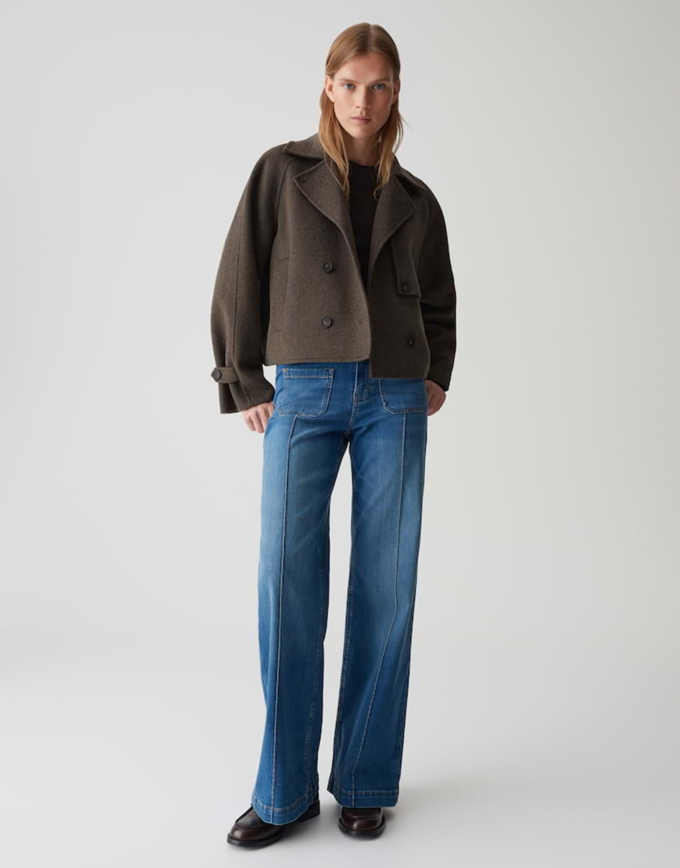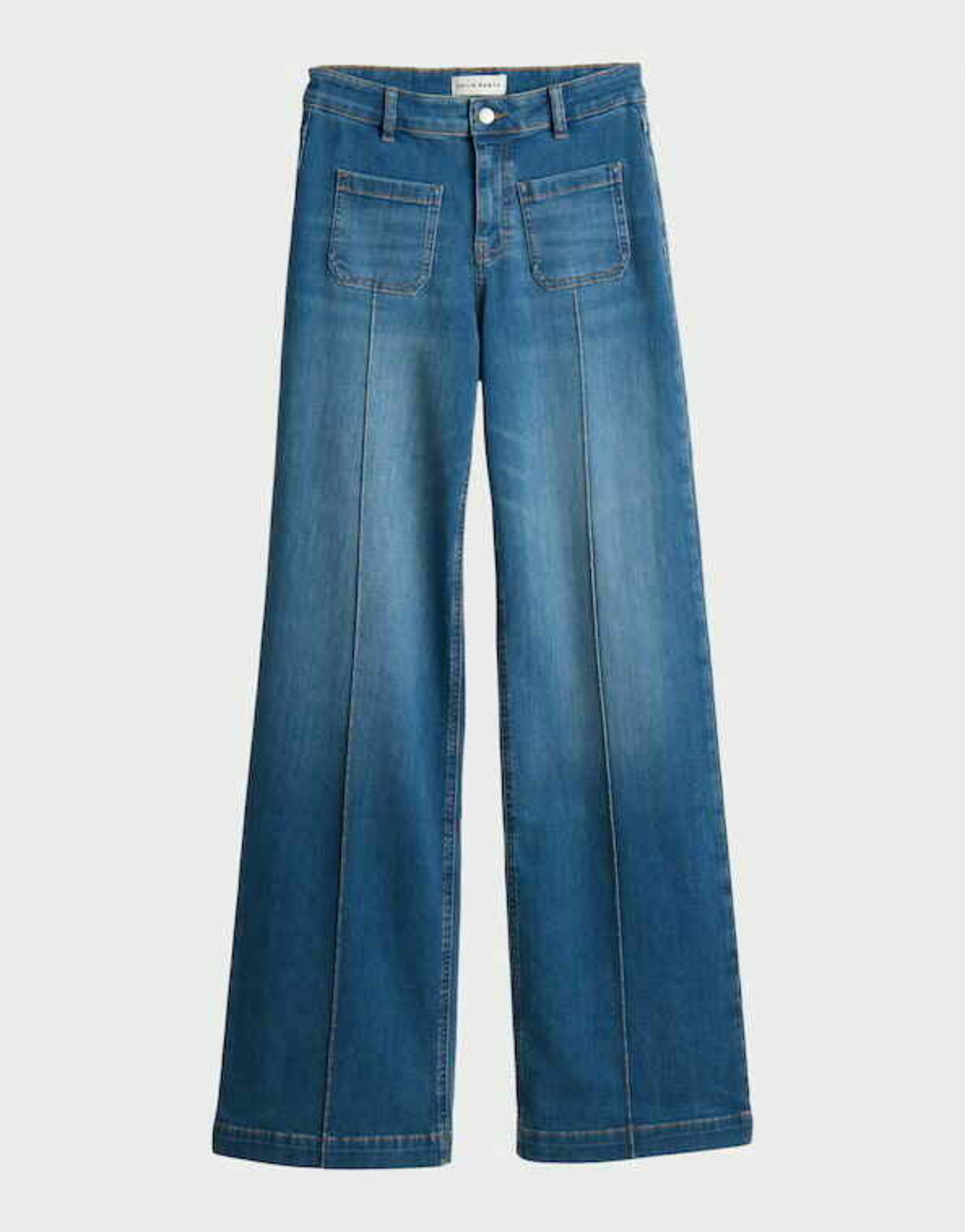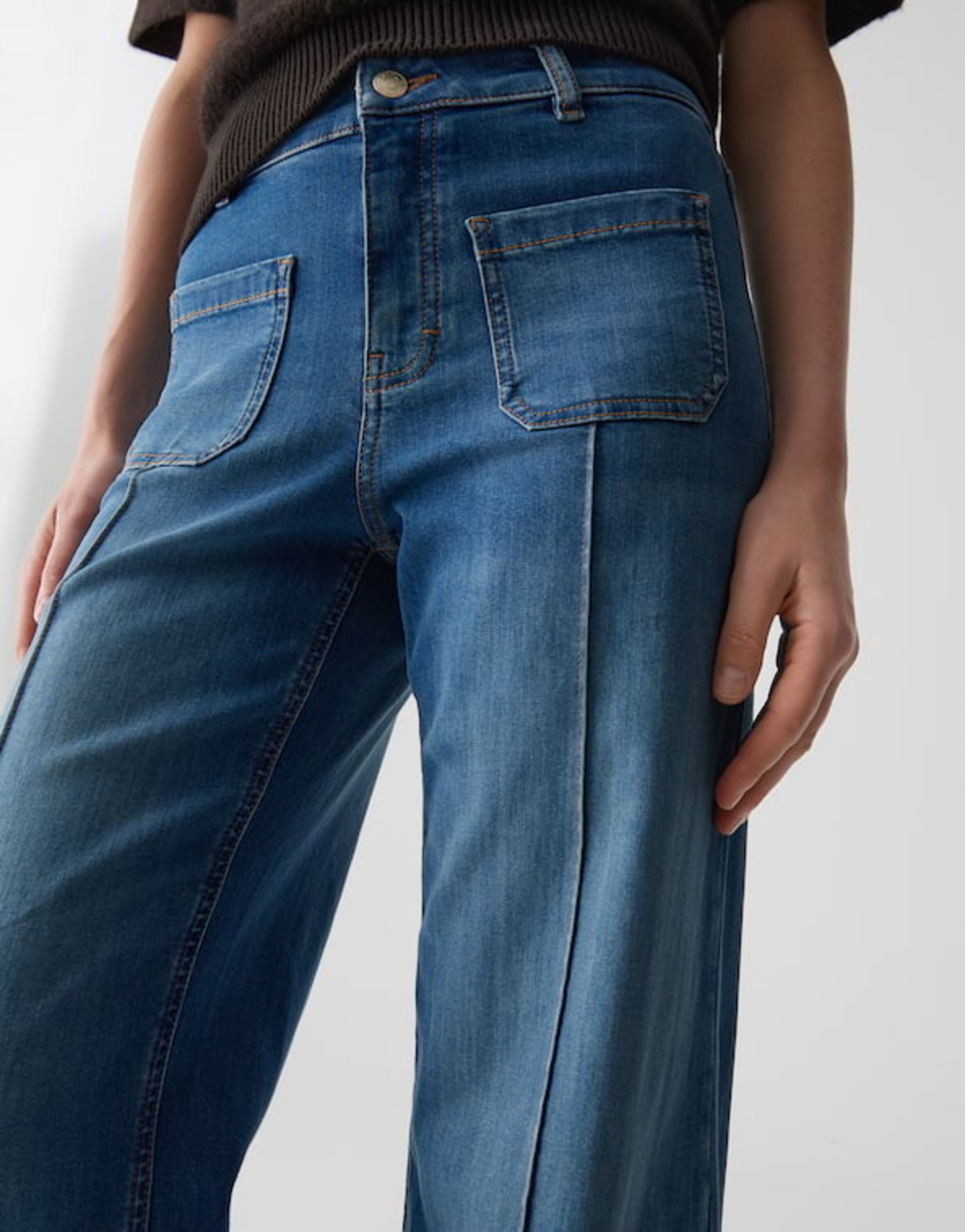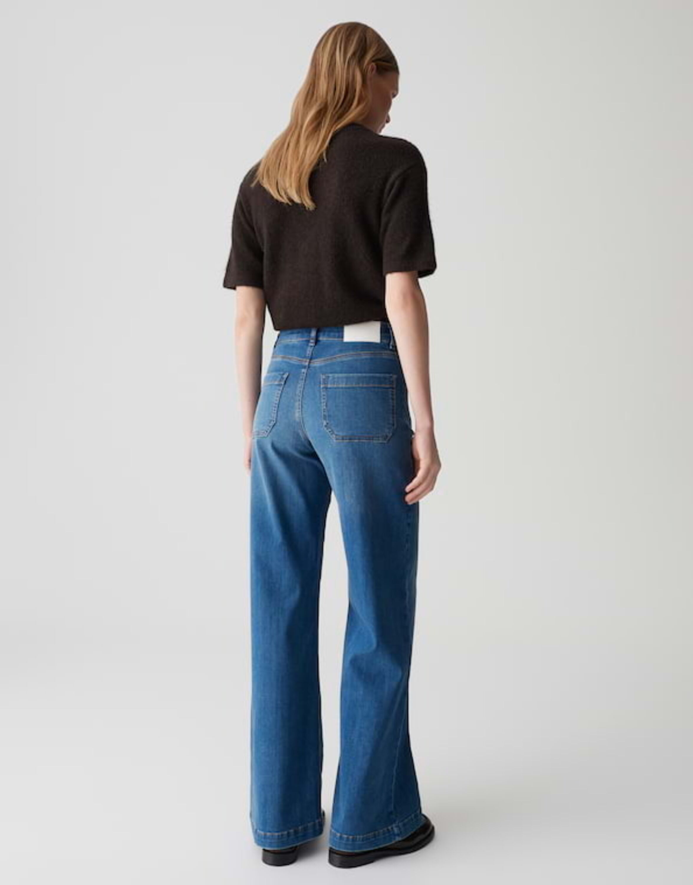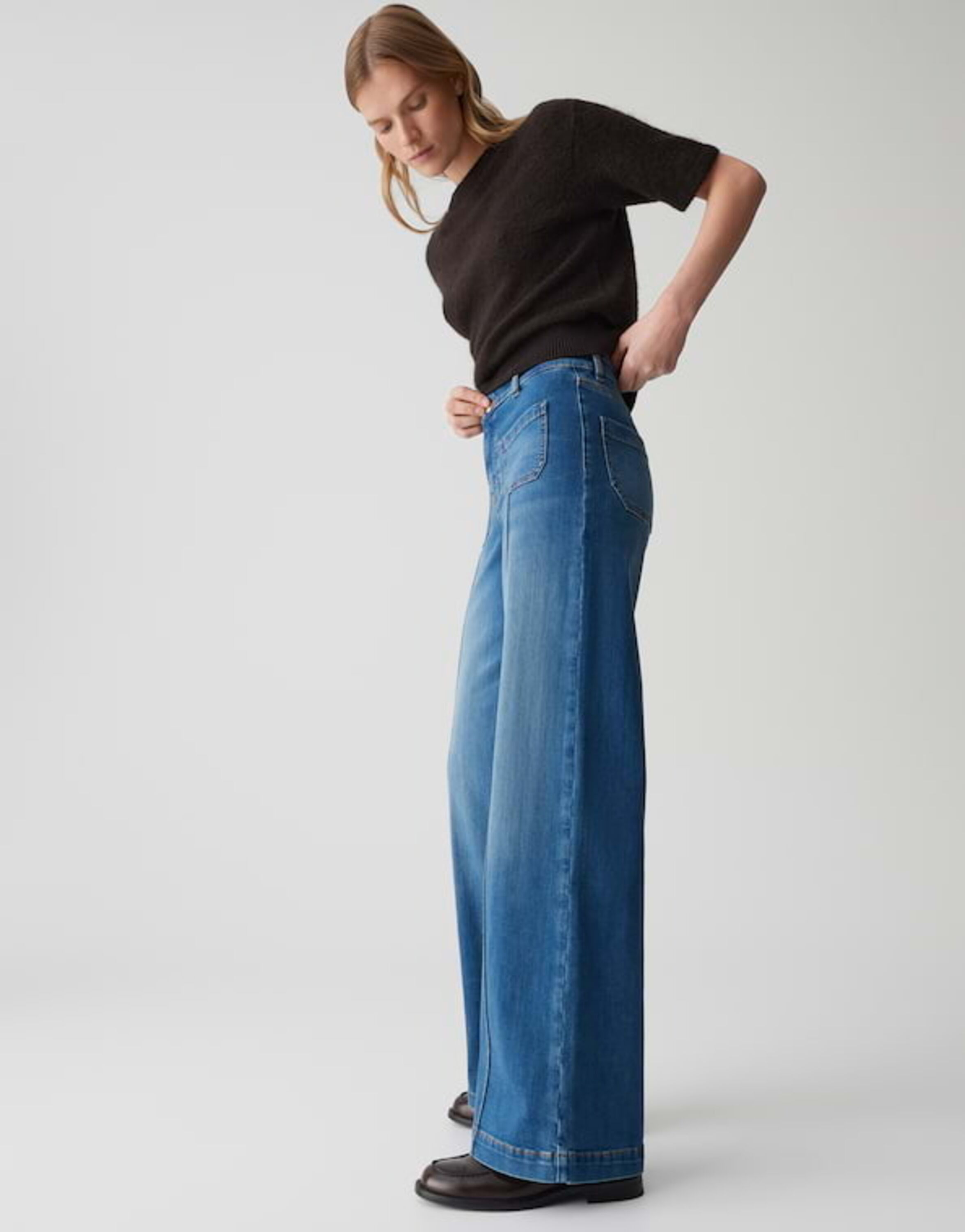 Die Palazzo Jeans mit weitem Bein kreiert eine elegante Silhouette, während die abgesteppte Biese an der Vorderseite moderne Akzente setzt und den Look für stilvolle City-Outfits perfekt macht.