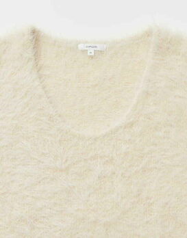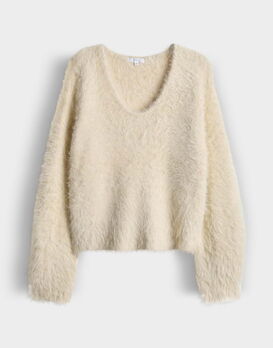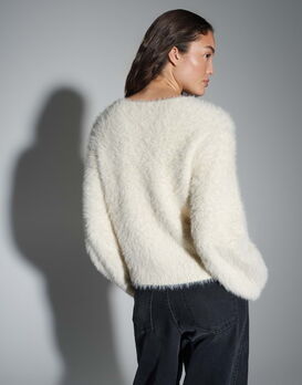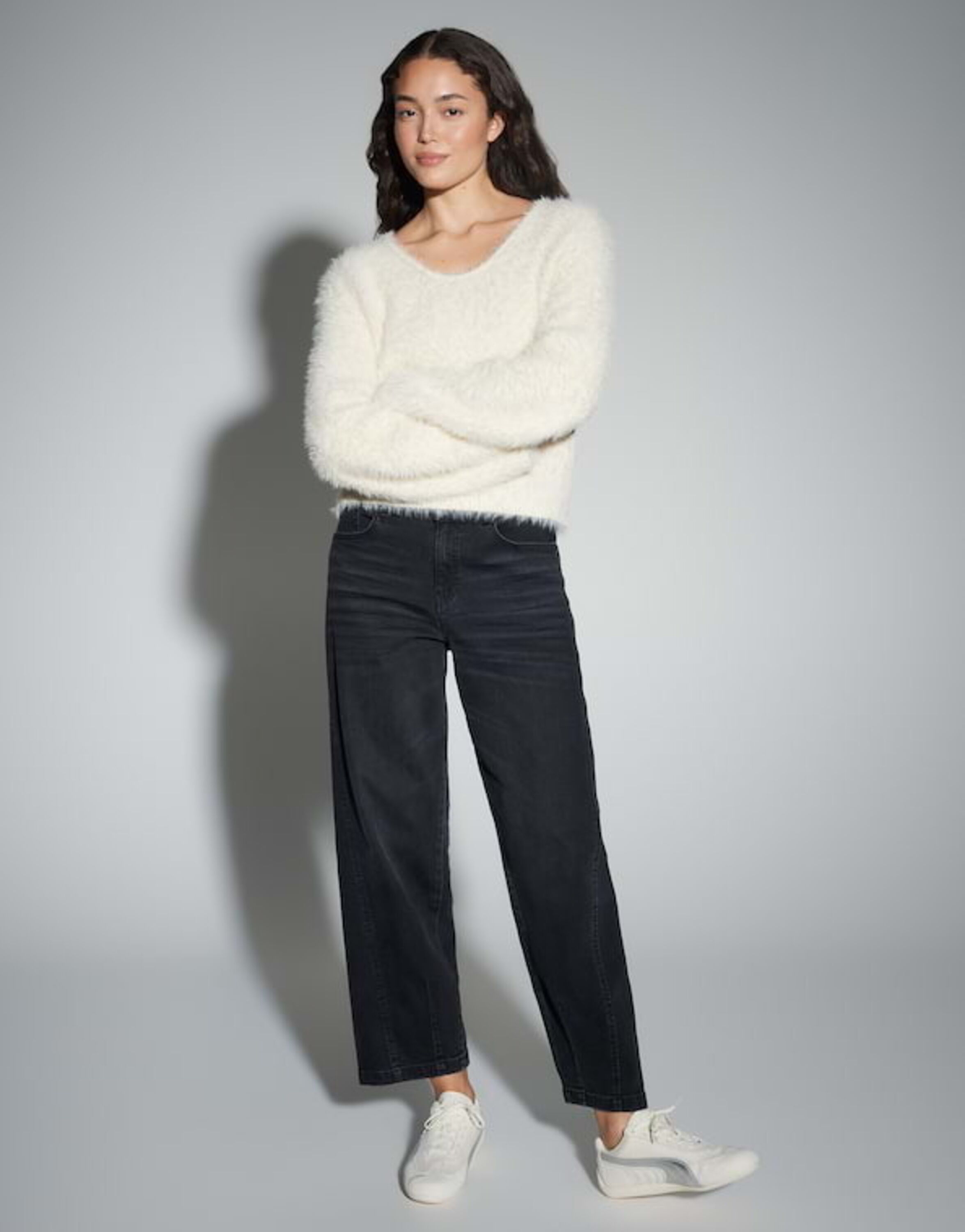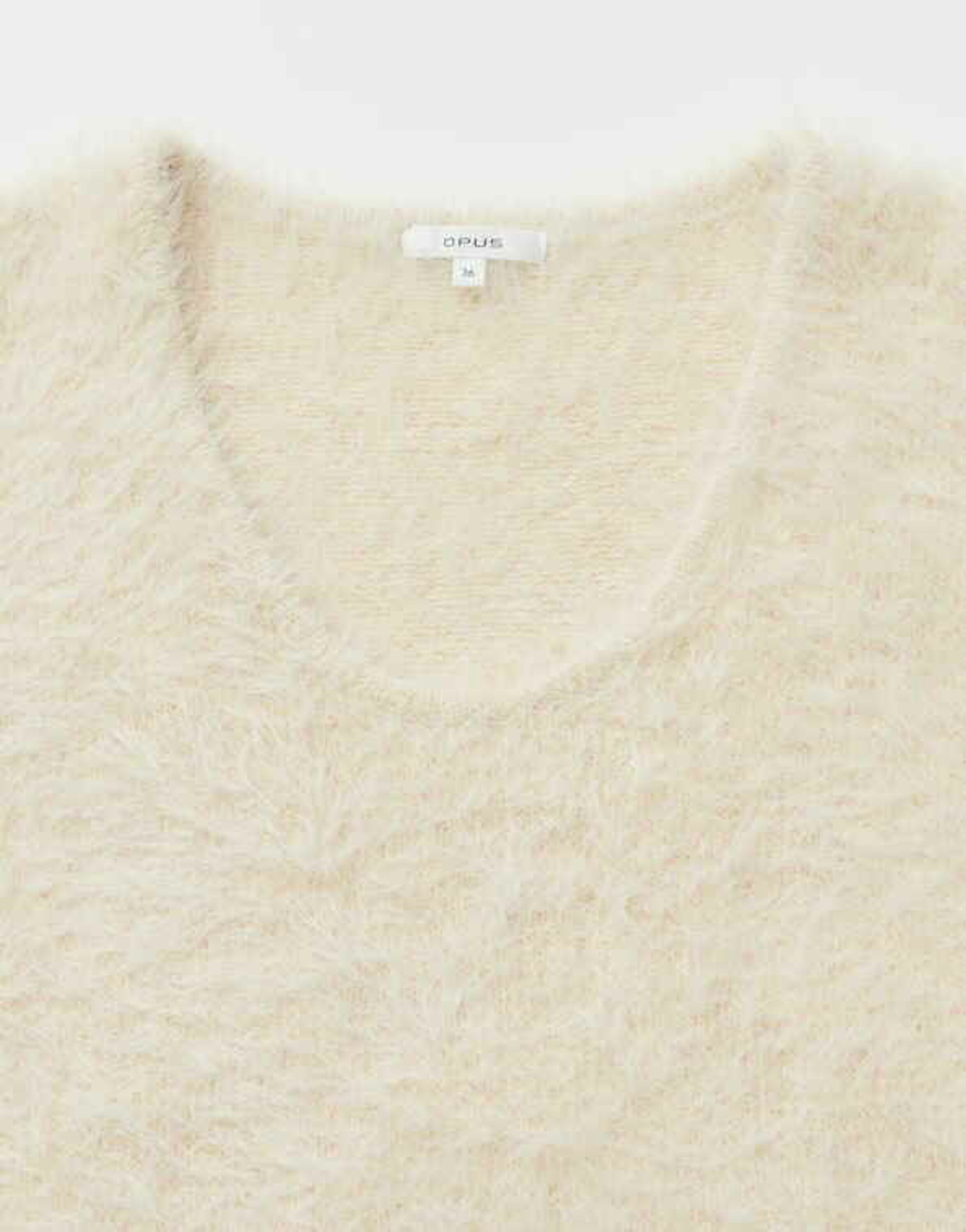 Weicher Strickpullover mit zartem Effektgarn begeistert durch seine leicht flauschige Struktur und den weit geschnittenen Rundhalsausschnitt. Ein moderner Begleiter, der Gemütlichkeit und stilvolle Lässigkeit mühelos vereint.