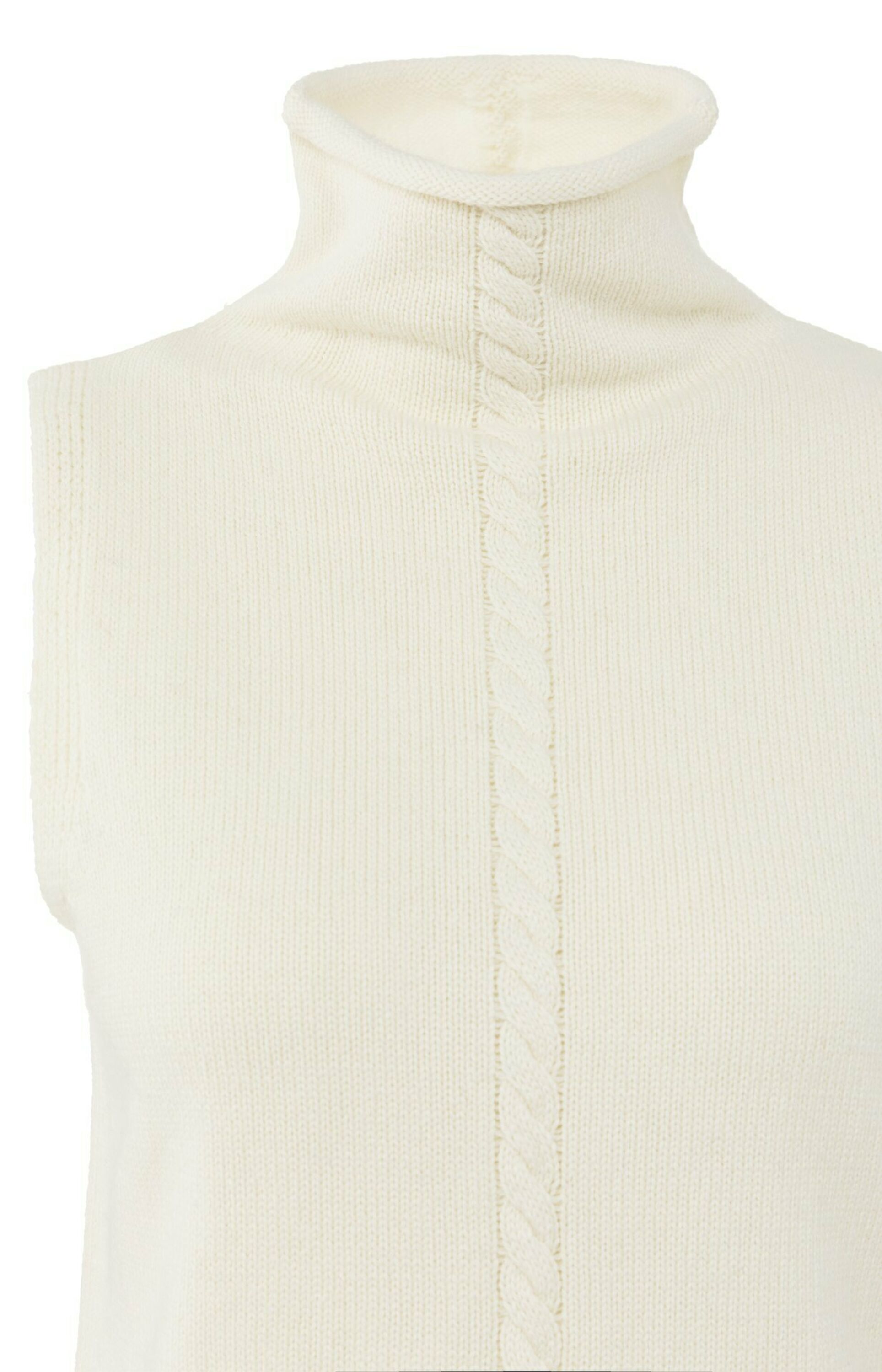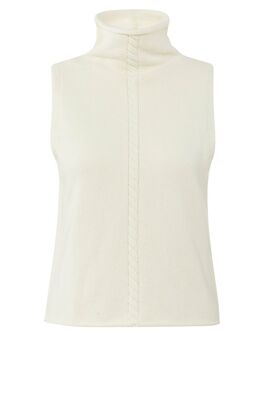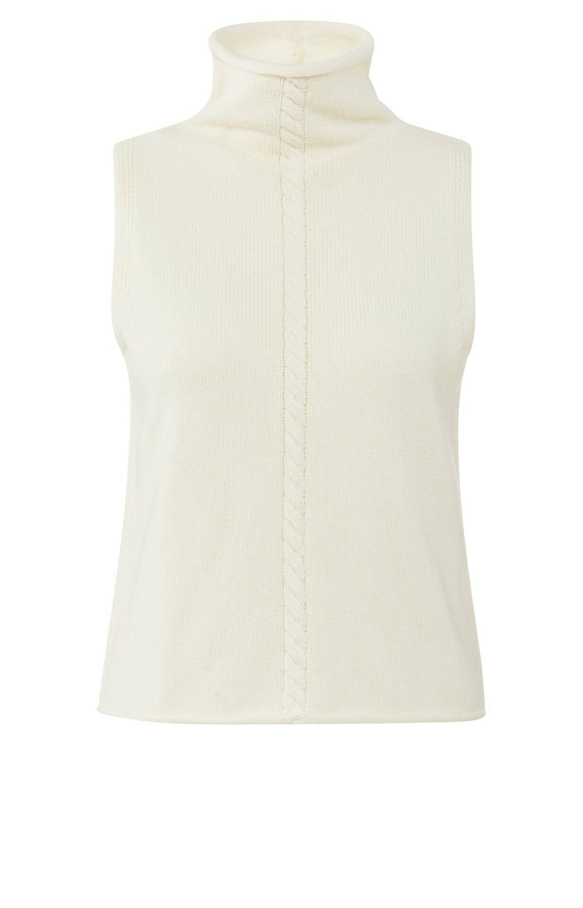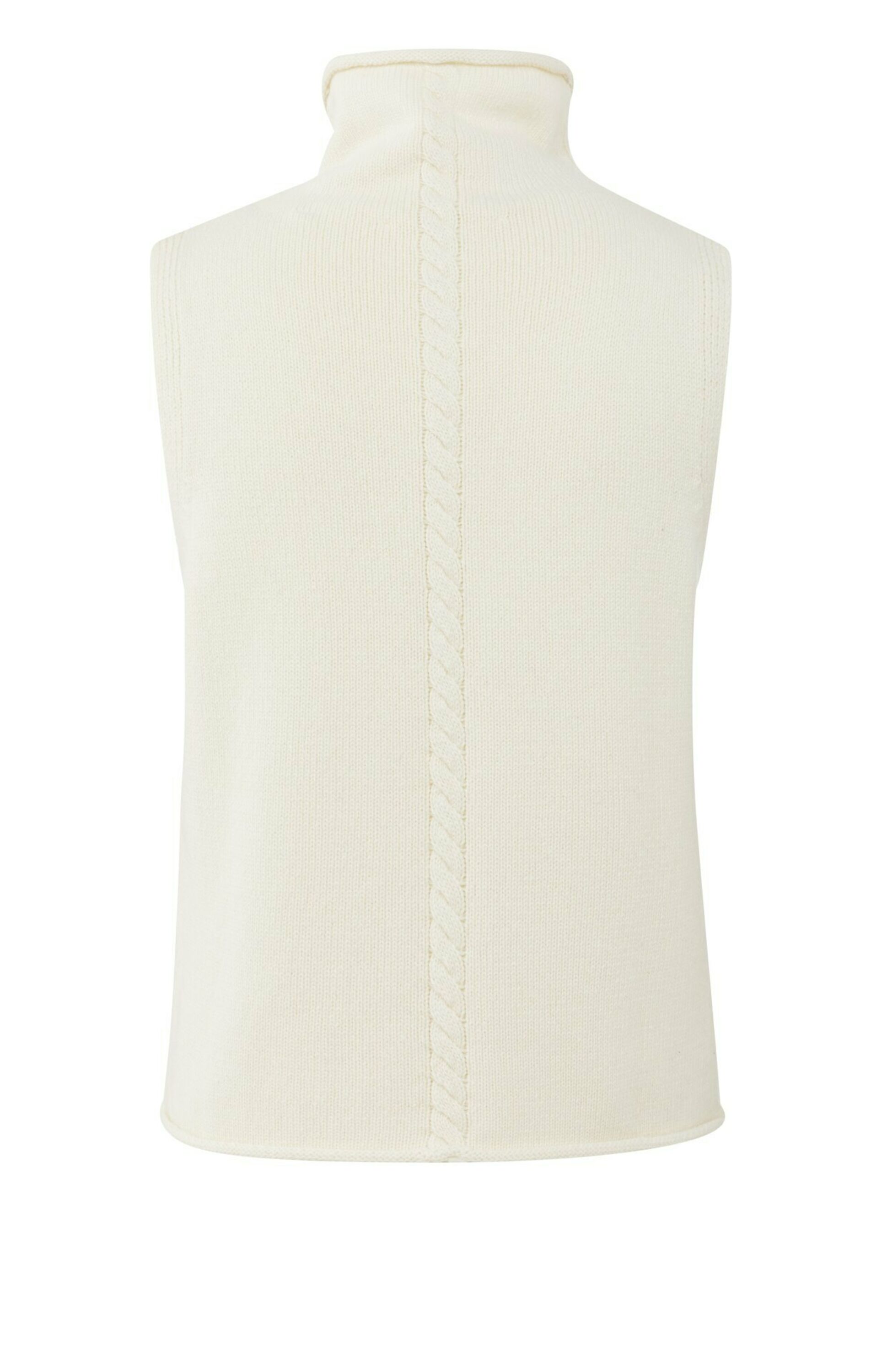Dieser ärmellose Pullunder hat einen hohen Kragen und eine eng anliegende Passform. Ein senkrechtes Zopfmusterdetail, das sich über Vorder- und Rückseite erstreckt, verleiht ihm eine raffinierte Note. Der Pullunder ist aus weichem, bequemem Stoff gestrickt und hat ein glattes Finish. Er lässt sich perfekt über einer Bluse oder solo tragen so entsteht ein gemütlicher und gleichzeitig eleganter Look.
