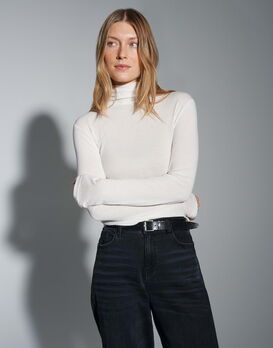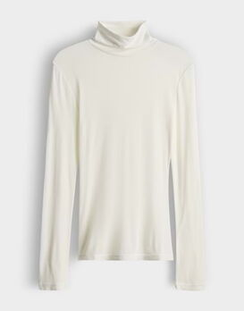 Weicher Rollkragen-Unterzieher aus hochwertiger Jerseyware im Tencel-Wolle-Mix überzeugt mit seidig glatter Haptik und zuverlässiger Wärme. Der figurnahe Schnitt macht ihn zu einem unverzichtbaren Basic für vielseitige Stylings an kalten Tagen.