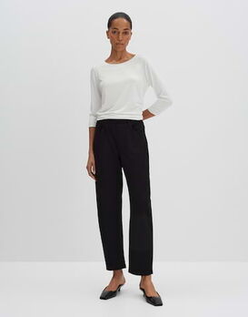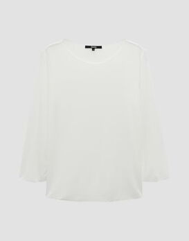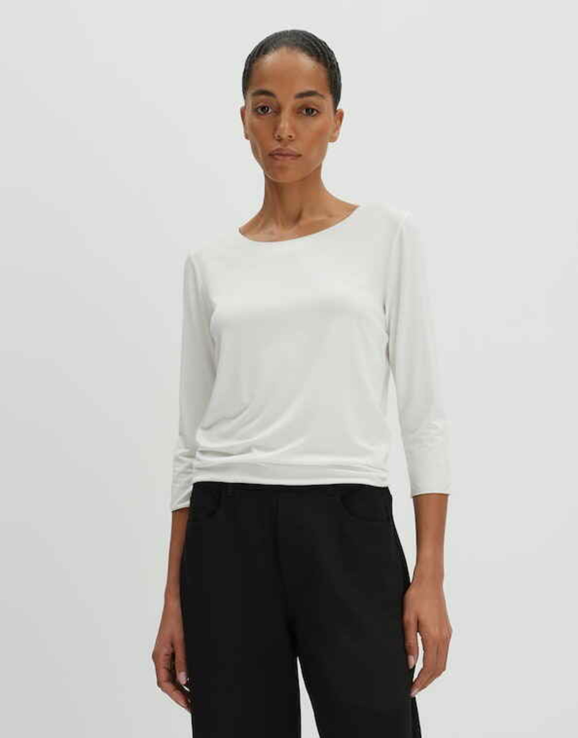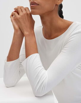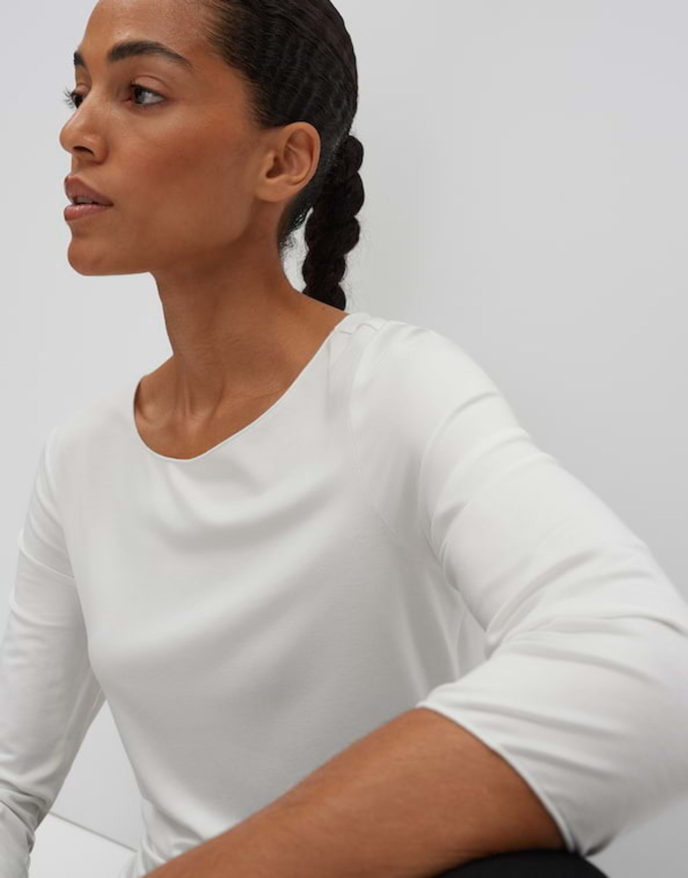 Das Basicshirt schmeichelt besonders durch den weiten Rundhalsausschnitt.