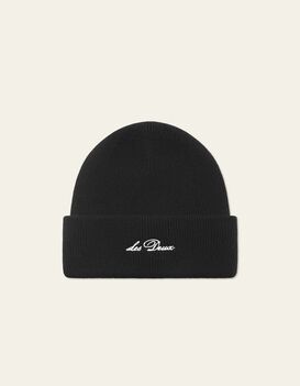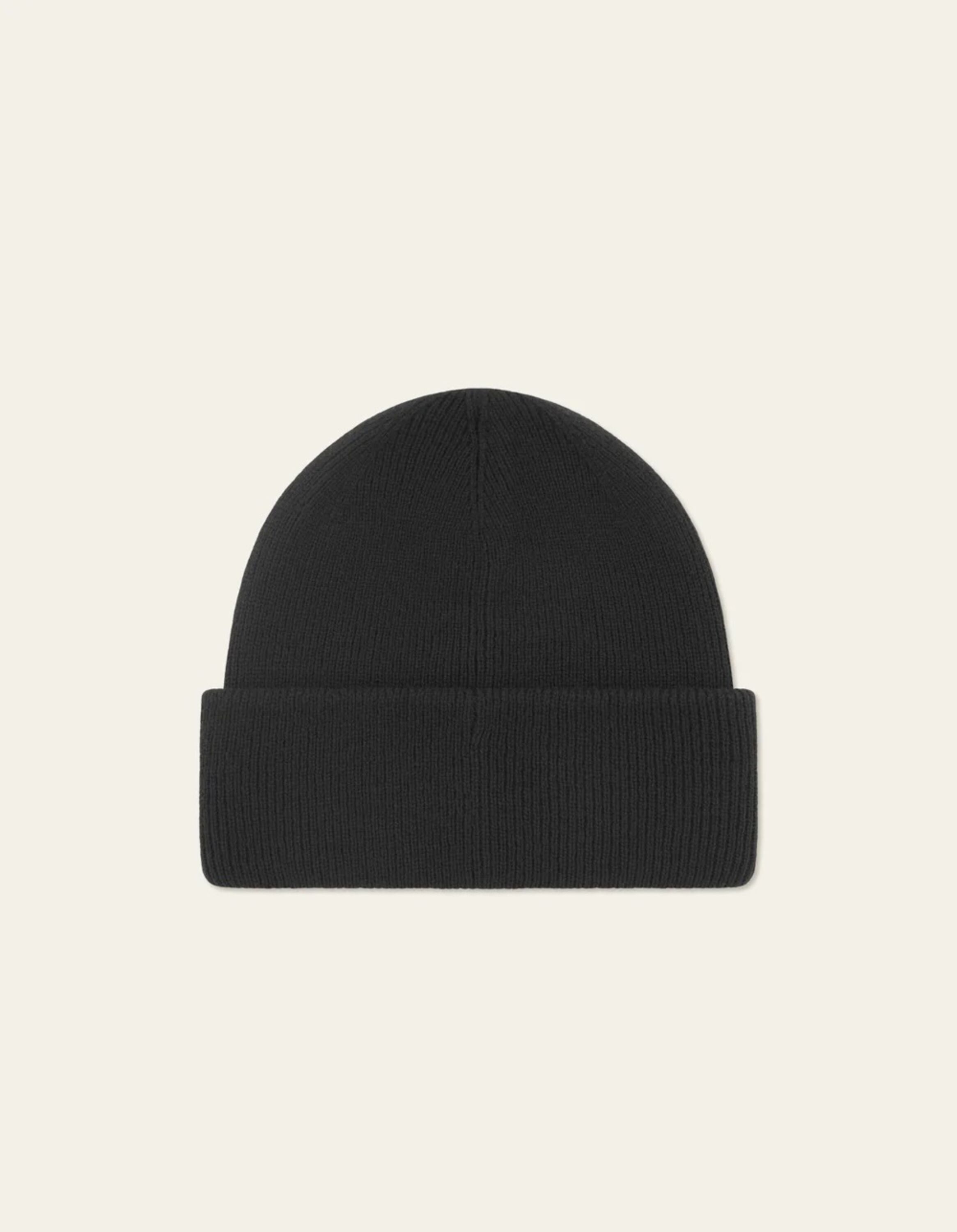 Die Wayne ist eine aus reiner Wolle gestrickte Beanie mit kursiv besticktem Schriftzug auf der Vorderseite – ein minimalistisches Accessory für den Winter.