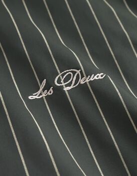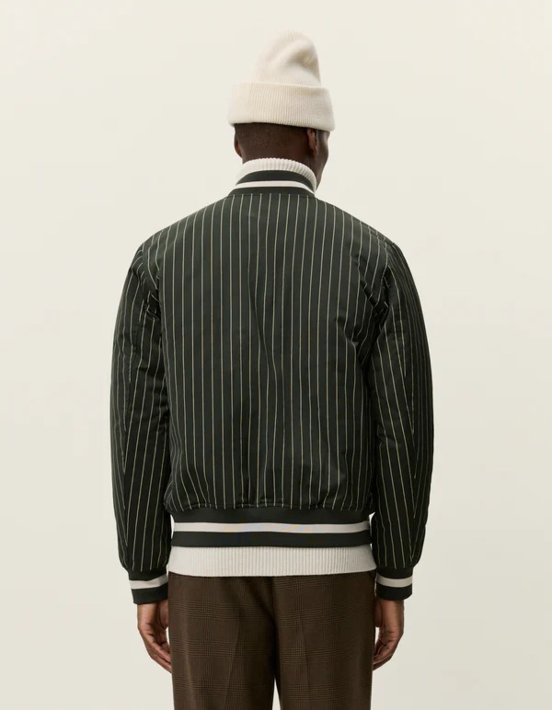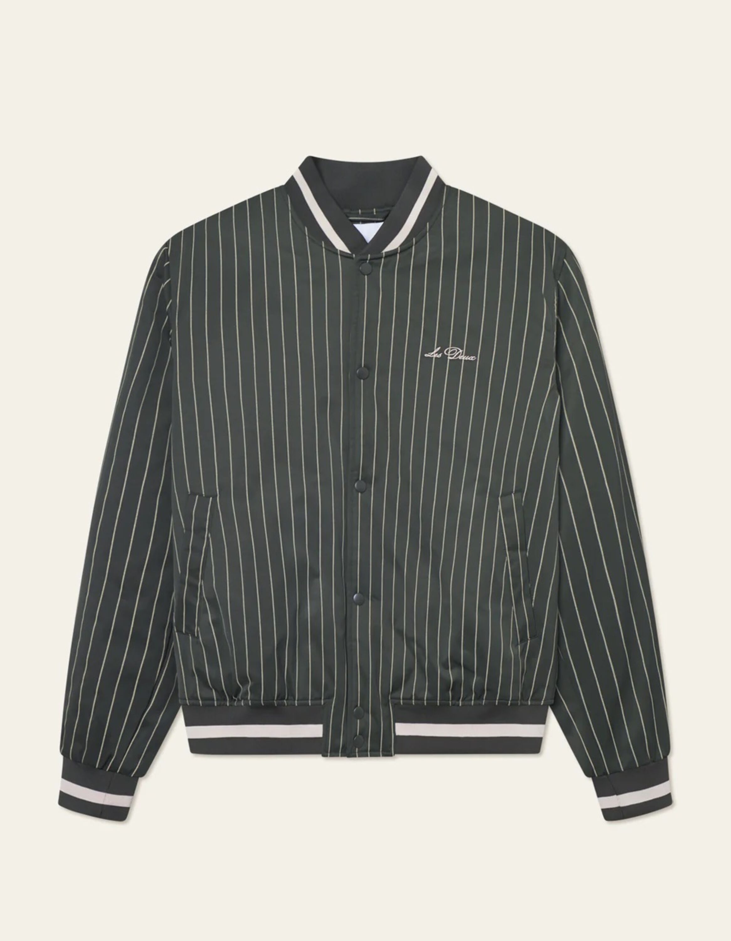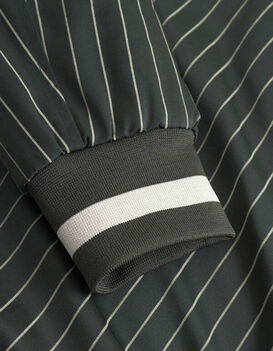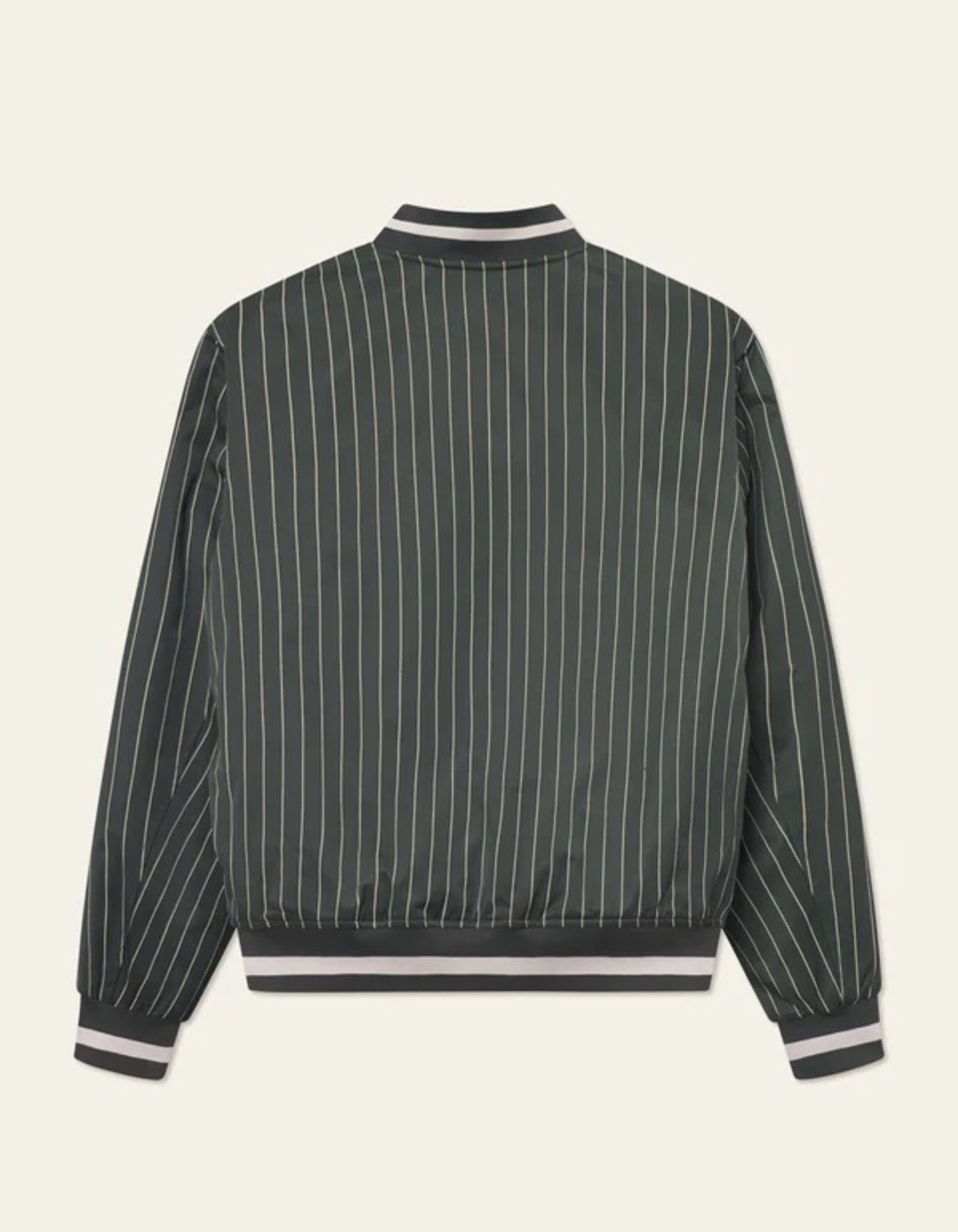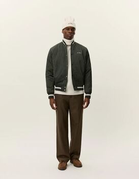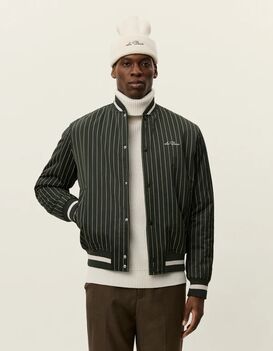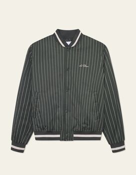 Old-School-Linien treffen auf moderne Stoffe. Diese Jacke im Varsity-Stil ist aus glänzendem Nadelstreifen-Twill mit feinem Schimmer gefertigt und überzeugt mit kontrastierenden Rippbündchen sowie einem bestickten Logo auf der Brust als perfekter Abschluss.